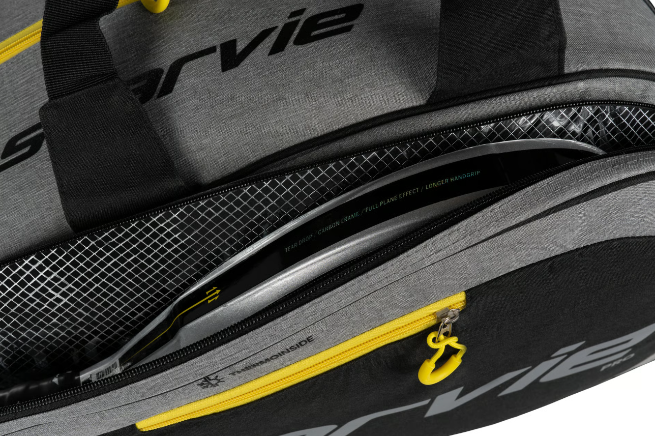 In Grau mit gelben Details zeichnet sie sich durch das doppelte Thermotech-Fach aus, das Schläger in optimalem Zustand hält, verfügt außerdem über ein belüftetes Schuhfach und eine Seitentasche für kleine Accessoires, ideal für SpielerInnen, die Wert auf Organisation legen. Mit einem bequemen und langlebigen Tragesystem ist es perfekt für jeden SpielerInnen.